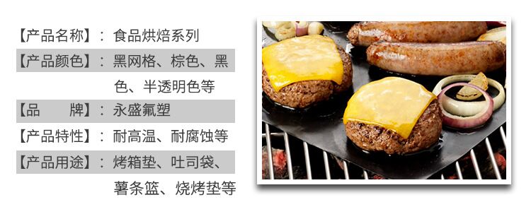 選用玻璃纖維基部,涂覆硅膠。用于食品預(yù)處理,加熱中的墊片,烤盤片,微波墊片;抗粘性優(yōu)良,用熱水或者清潔劑即輕松去除表面的油漬、污點(diǎn)等,并可反復(fù)使用;柔軟性好,儲(chǔ)藏方便,非食品用刮刀、尖銳金屬等不可觸碰烤盤片;耐溫性能好,常規(guī)耐溫達(dá)480華氏度。